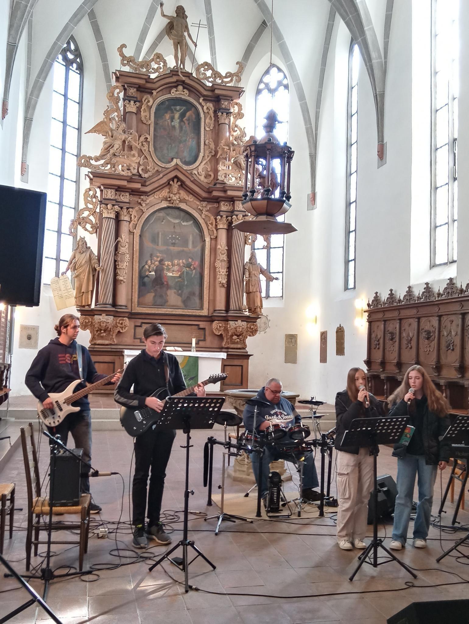 Immer montags zwischen 18 Uhr und 19:30 Uhr treffen sich derzeit 5-6 motivierte jugendliche Instrumentalisten mit Gitarre, Bass, Gesang und Drums im Probenraum im UG des Gemeindehauses.