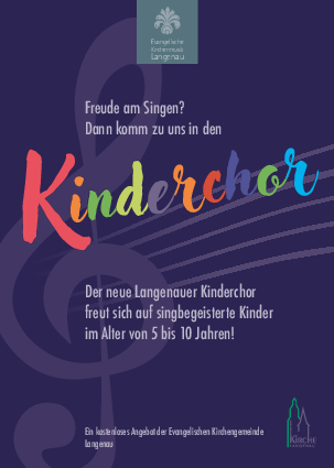 Der Langenauer Kinderchor besteht aus rund 20 Mädchen und Jungen im Grundschulalter. Zu unserem Repertoire gehört eine Vielzahl von geistlichen Liedern, die im Kirchenjahreskreis beheimatet sind. Ebenso werden weltliche Lieder oder Kanons gesungen. Im Kinderchor üben wir schon das genaue Singen nach Noten, auch gestalten wir die Gesangs - und Atemtechnik bewusst. Ein Singspiel oder Musical begleitet uns z.B. mehrere Wochen in den Proben. Außerdem singen wir im Familiengottesdienst oder bei Gemeindefesten.